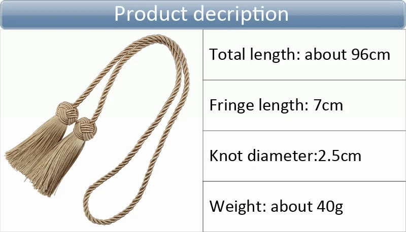 Elevate your home décor with our Curtain Tiebacks featuring luxurious 2-head tassels, a timeless blend of style and sophistication. These decorative tiebacks not only keep your curtains neatly pulled back but also add a graceful touch to any room.