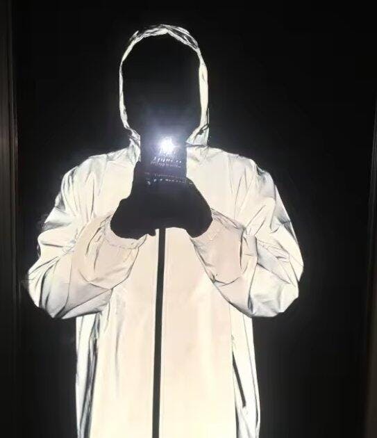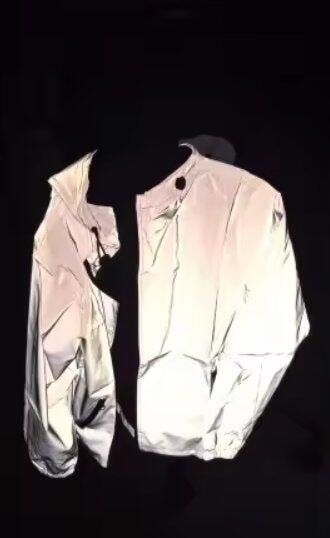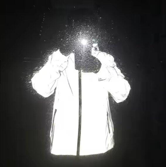 The jacket’s unique reflective finish enhances visibility under light, making it both eye-catching and practical for nighttime activities.